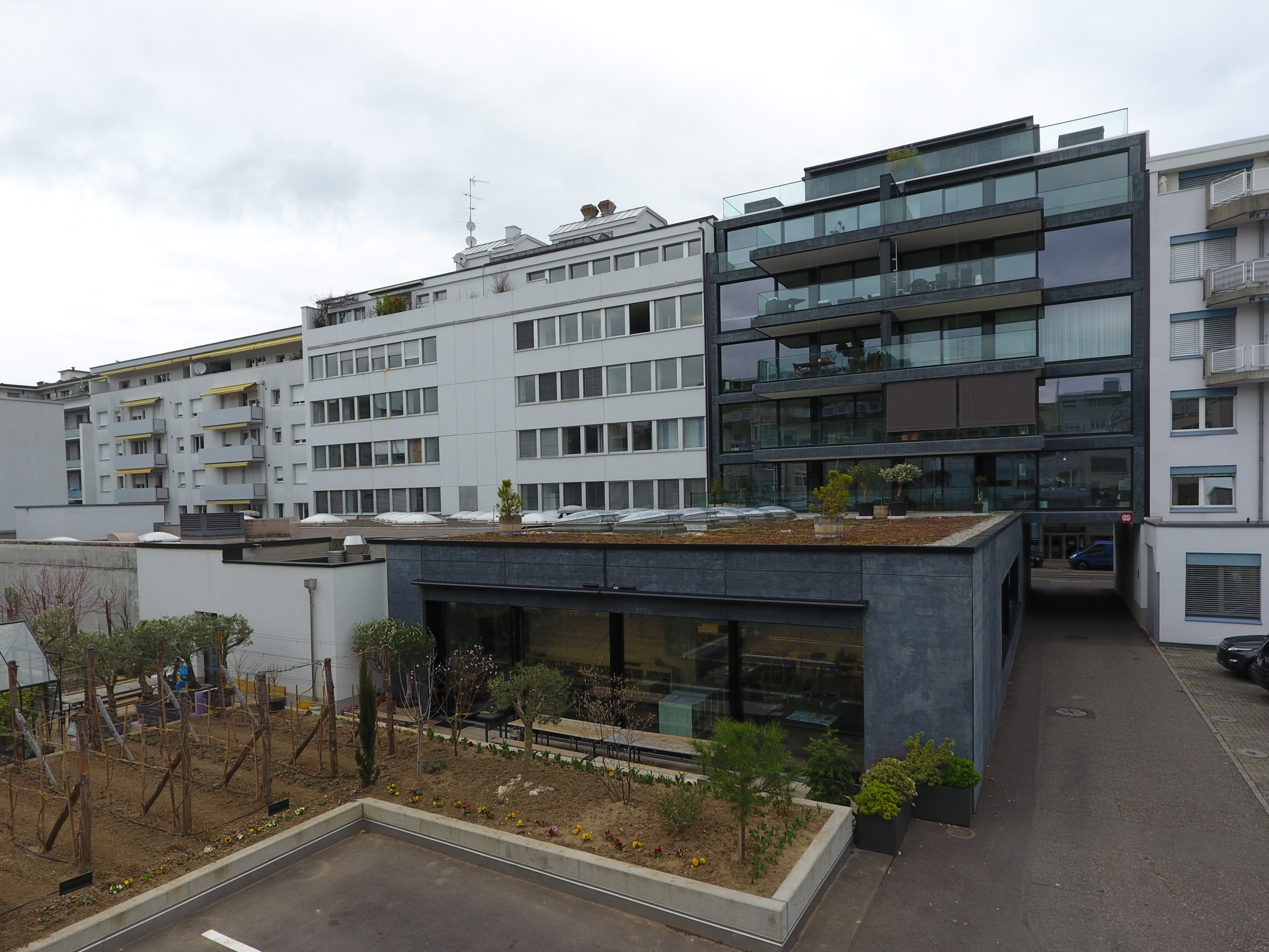 Der Neubau beherbergt Büro- und Gewerbenutzungen in den ersten zwei, sowie acht Wohneinheiten in den oberen vier Geschossen. Im Untergeschoss befindet sich eine Autoeinstellhalle. Zusätzlich wird das Erdgeschoss im Innenhof durch einen eingeschossigen Anbau erweitert. Das Gebäude vervollständigt somit die, für das Quartier typische Blockrandbebauung. Im Inneren entstand eine gefasste Hofsituation mit einem gestalteten Grünbereich.