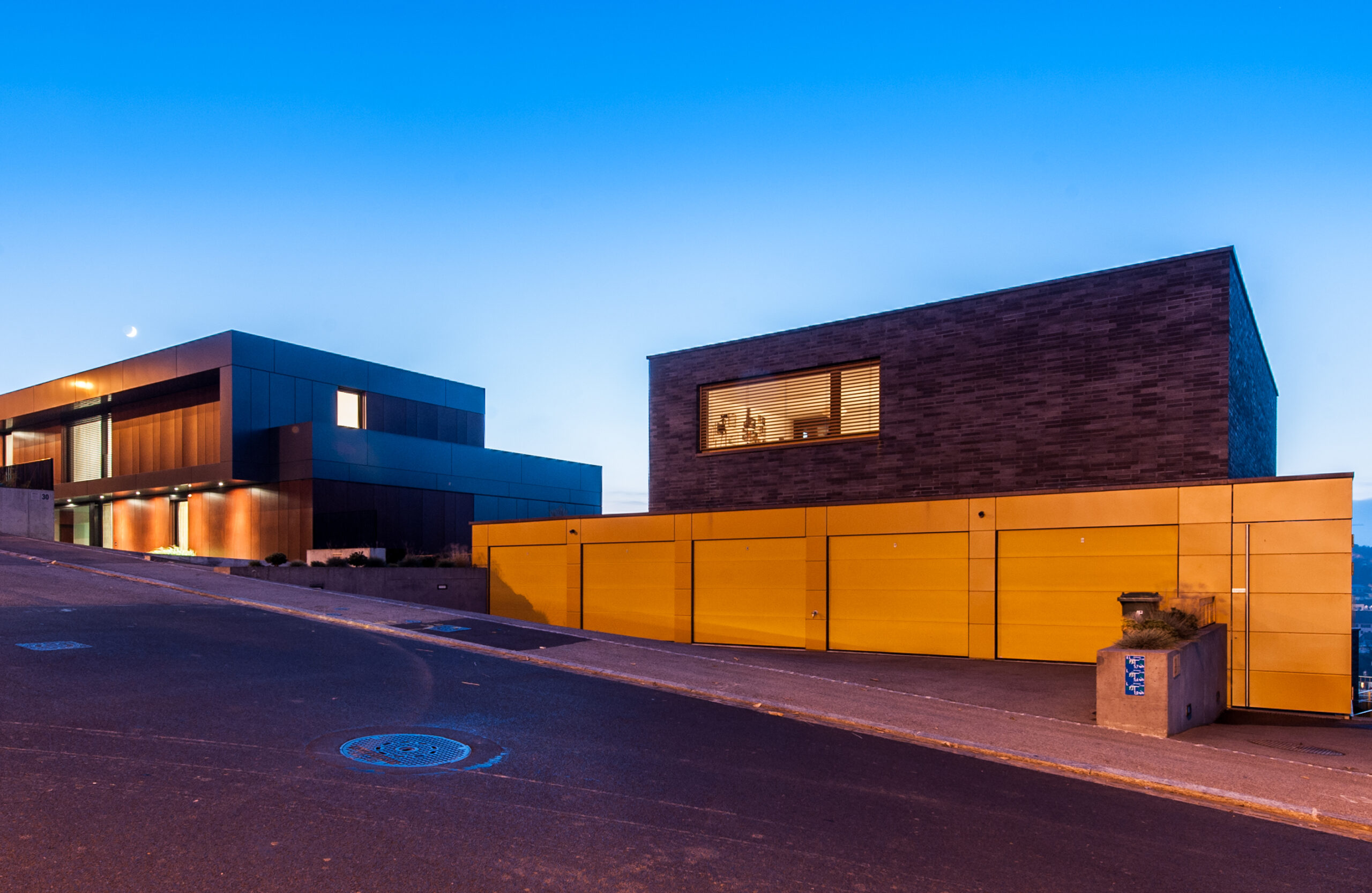 Durch die Hanglage der Bauparzelle bietet sich die Haupterschliessung der 6 Wohneinheiten über einen Tiefhof und ein separater Zugang zur Attikawohnung an, so kann auf ein Treppenhaus im Attikageschoss verzichtet werden. Die notwendigen Stellplätze werden in zwei Garagen untergebracht, welche sich strassenseitig am oberen und unteren Ende des Baukörpers befinden.
