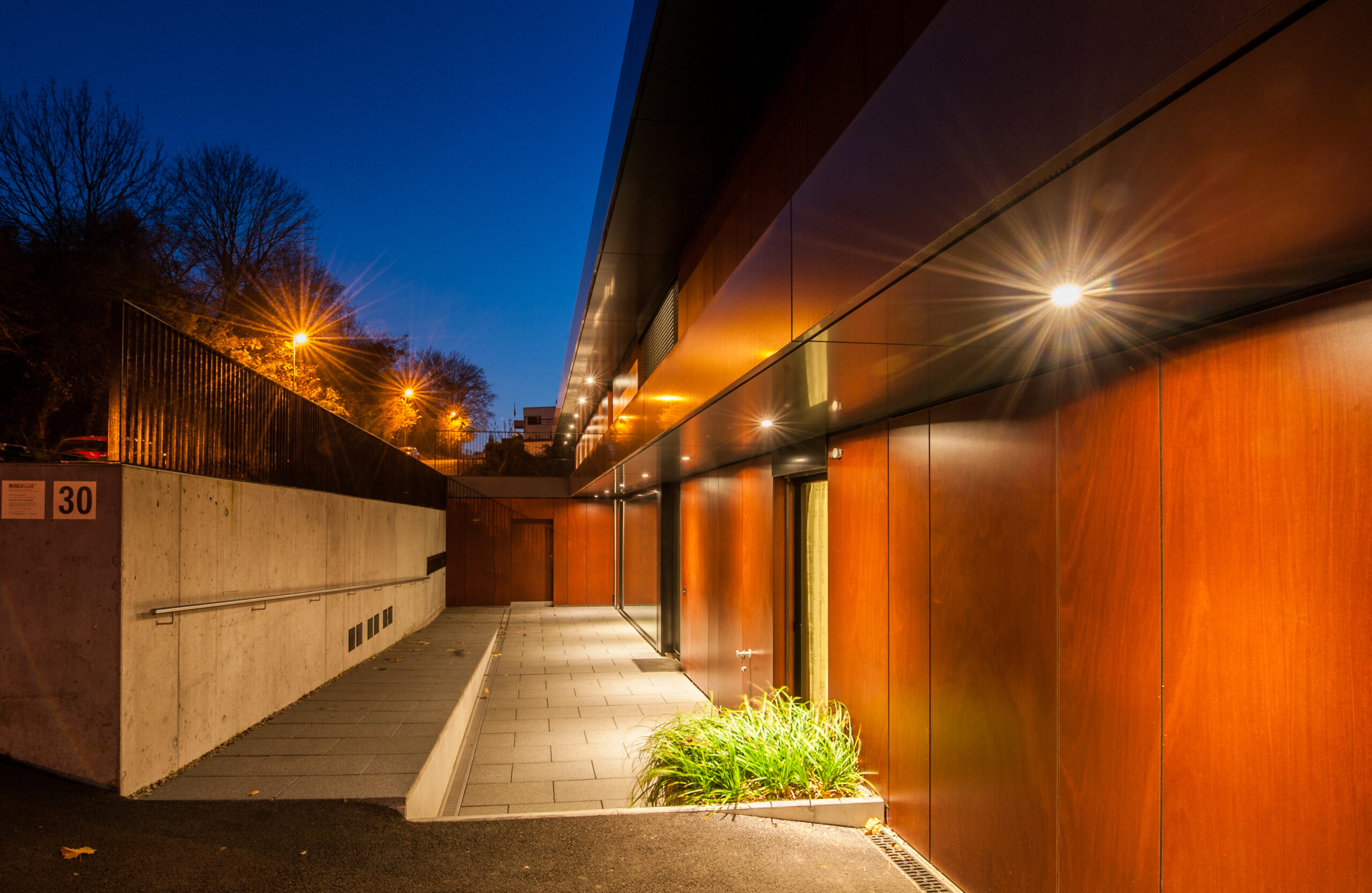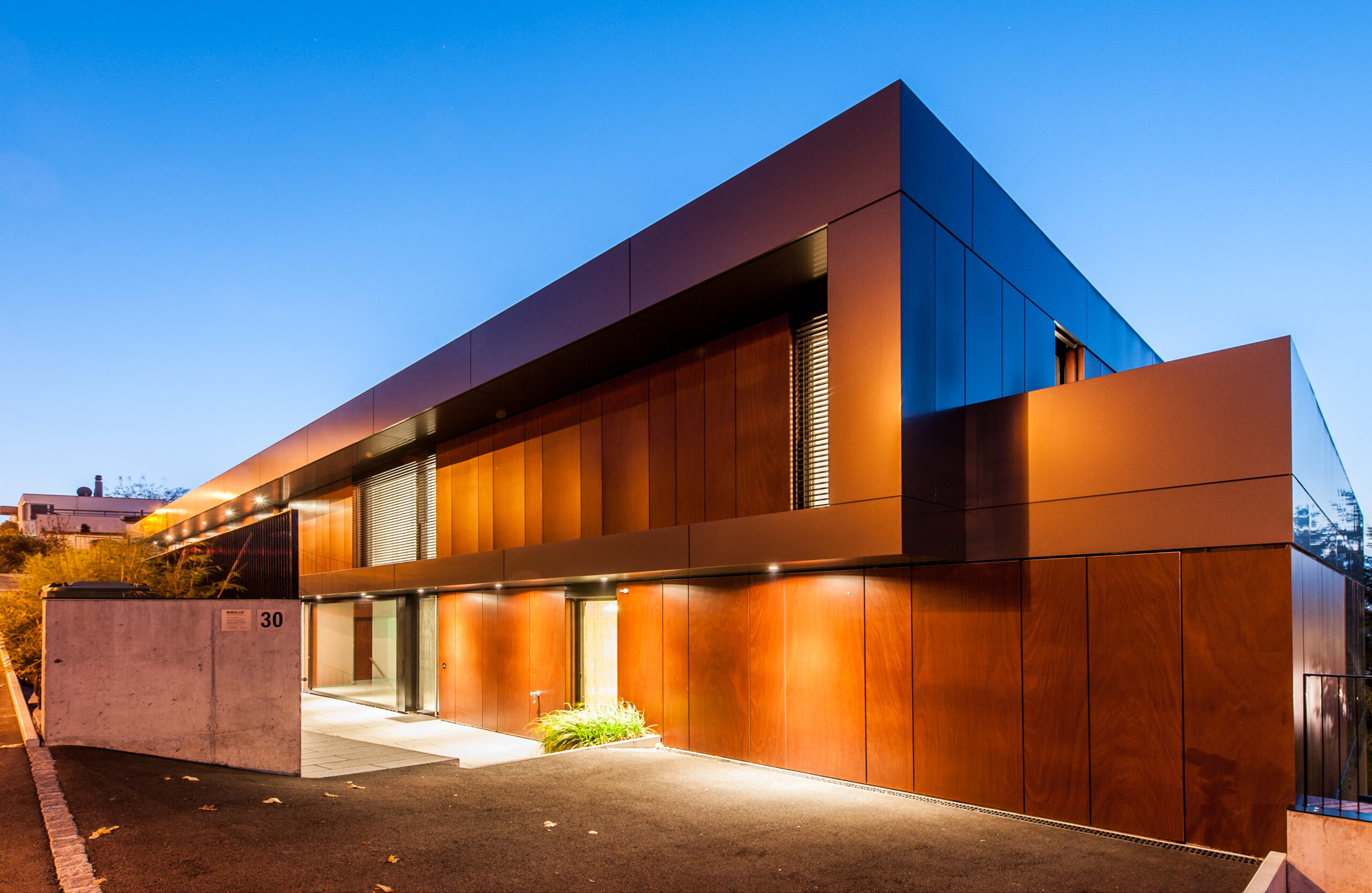 Gartenseitig (Westen) ist dem Gebäude eine Balkon-/ Wintergartenzone vorgelagert. Die Anordnung der Wintergärten wurde so gewählt, dass eine möglichst grosse Fläche an Balkonen und Sitzplätzen generiert werden konnte. Hierzu werden die Wintergärten pro Geschoss versetzt, so dass ihre Dachflächen als Balkone genutzt werden können. Durch diese Anordnung entsteht zudem ein Wechselspiel verschiedener Gebäudetiefen, welches Tiefe und Spannung in die Fassade bringt. Um den Baukörper zu fassen und als Ganzes wahrnehmbar zu machen wurden die freien Eckbereiche mit Wandfeldern und Bügeln ergänzt. Die Tragkonstruktion des Gebäudes besteht überwiegend aus Beton. Nicht tragende Innenwände wurden in Trockenbauweise geplant. Die Fassade ist mit dunkelgrauen Blechtafeln verkleidet, als Kontrast sind in Teilbereichen rötlich-braune Holztafeln verbaut.