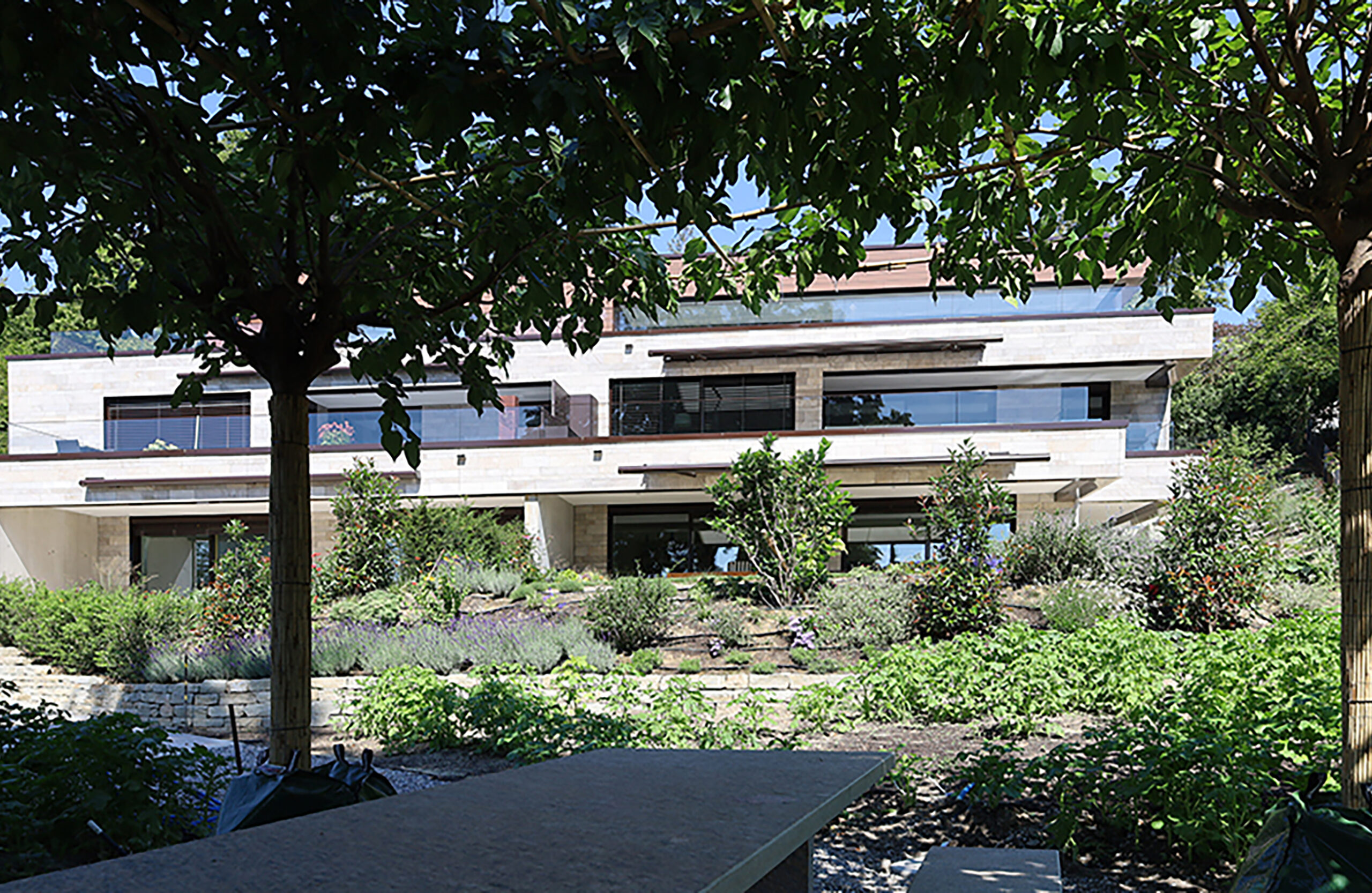 Mit der Platzierung der beiden Gebäudekörper, entstand eine zentrale parkähnliche Grünzone, die von alten Bäumen und Baumgruppen umrahmt und von Einblicken geschützt wird. Die Gebäude fügen sich harmonisch in den bestehenden Grünraum ein. Die erhöhte Parzelle mit leichter Hanglage bietet zusätzlich einen weitschweifenden Blick auf angrenzend. Wohngebiete von Arlesheim und Dornach und ermöglicht zudem einen Ausblick auf den Basler Jura mit der Ruine der Pfeffinger Burg.